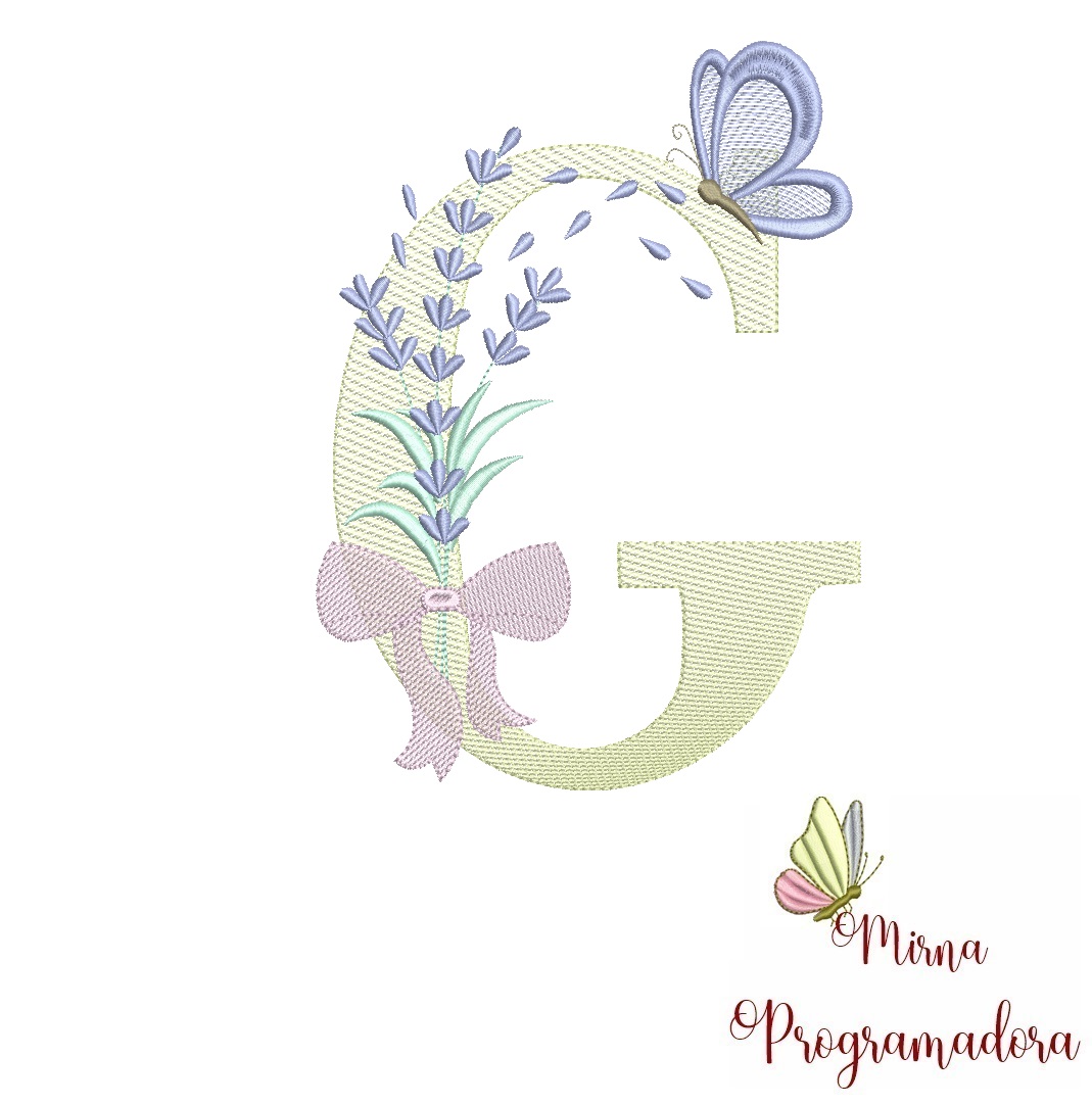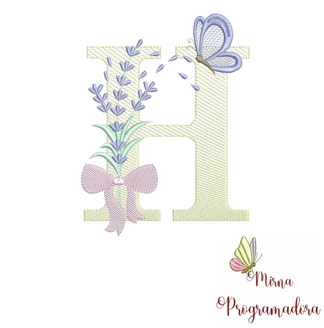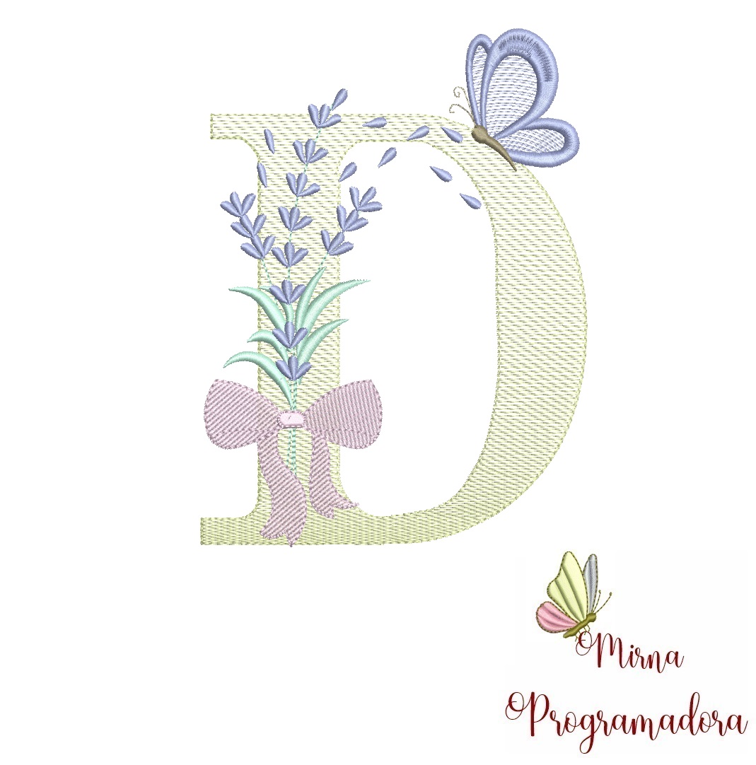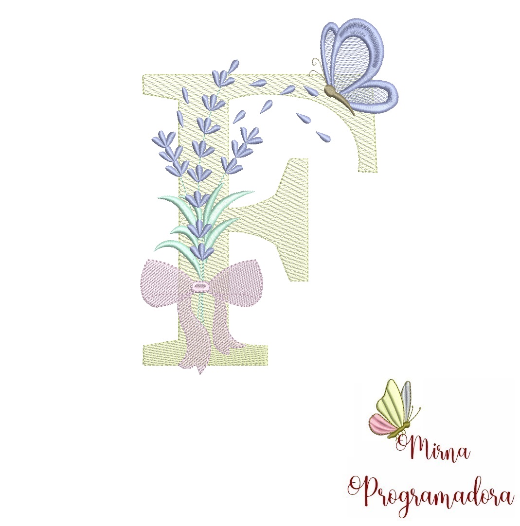 Matriz De Bordado Alfabeto Lavanda com Laço e Borboleta para bordar.