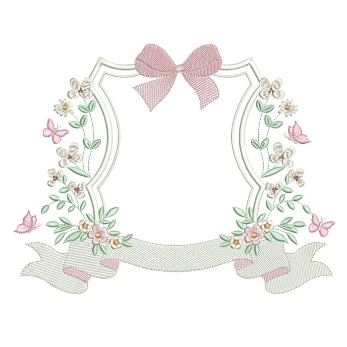 Matriz De Bordado Moldura Flores e folhas com Laço e Borboletas para bordar.
