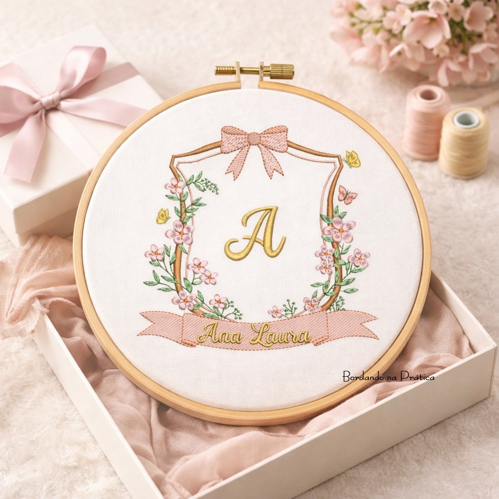 Matriz de Bordado Coleção Brasão Moldura Flores laço com nomes para bordar