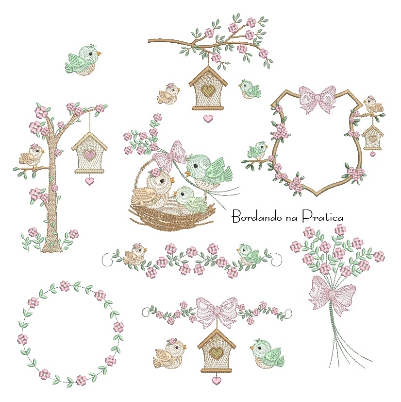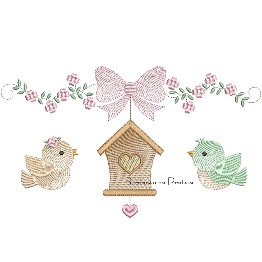 Matriz de Bordado Passarinhos com raminho e laco para bordar