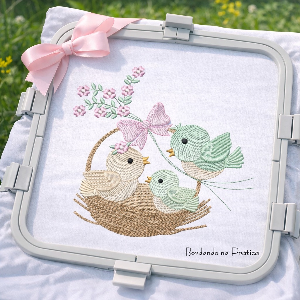 Matriz de Bordado Ninho em forma de cesta com buquê, com Passarinho e Flores para bordar