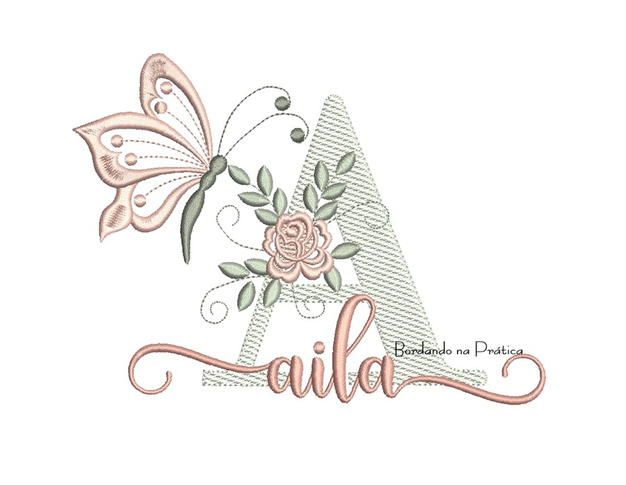 Matriz De Bordado Nome Aila sobreposto para bordar com borboleta e flor.