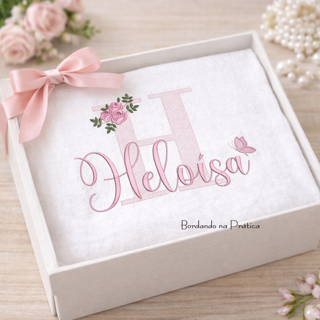 Matriz de Bordado nome Heloísa para bordar com Flores, borboleta e letra.