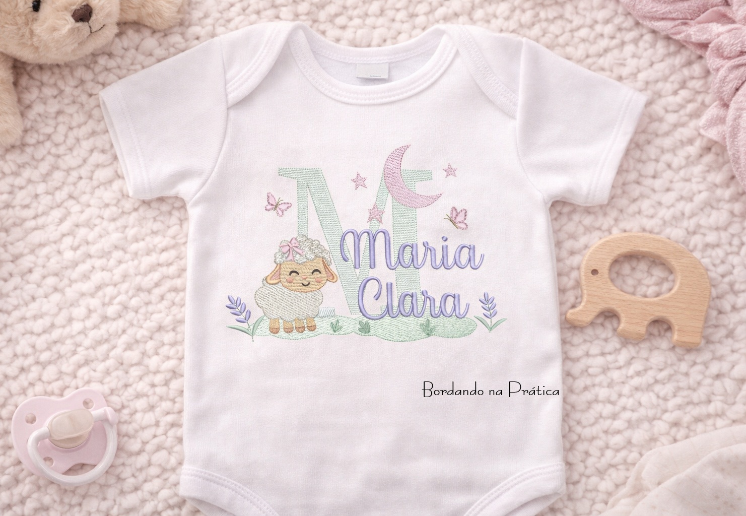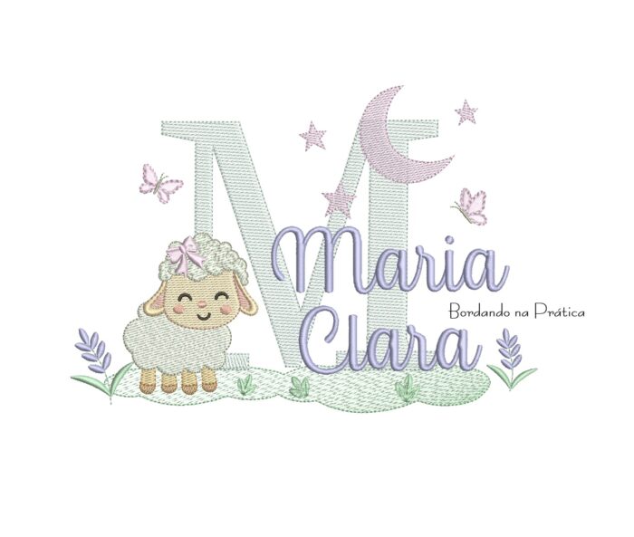 Matriz de bordado nome Maria Clara. Composição delicada com ovelhinha baby com laço, borboletinhas, lua e estrelinhas, inicial decorativa e detalhes de folhas, criando um conjunto encantador e ideal para peças infantis personalizadas.